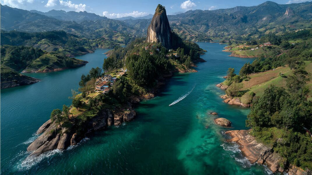 Heute führt die Reise zunächst in die östliche Bergregion Antioquias. Ziel ist der imposante Piedra del Peñol, ein über 200 Meter hoher Monolith, der majestätisch aus der Landschaft ragt. Über eine in den Felsen eingelassene Treppe gelangen Sie hinauf zur Aussichtsplattform. Oben eröffnet sich ein überwältigendes Panorama: ein Labyrinth aus grünen Hügeln, tiefblauen Seen und kleinen Inseln,